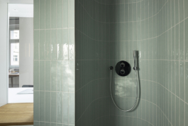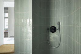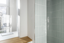 Im Bereich des Sekretärs wird ein Fenster in das Möbel eingeschnitten. Das Fenster verbindet somit das Bad mit dem Außenraum – dadurch wird ein Blick nach draußen ermöglicht.
