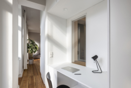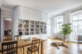 Eine junge Familie braucht mehr Platz. Aus diesem Grund werden in einem klassischen Berliner Vorderhaus zwei benachbarte Wohnungen zusammengelegt. Die Leichtbauwände im Bestand werden zurückgebaut, so dass an der Straßenseite ein großer Raum zum Wohnen, Essen und Schlafen entsteht, wobei der Schlafbereich von einem neuen Raummöbel separiert wird.