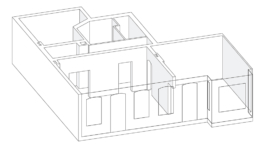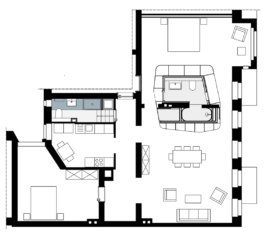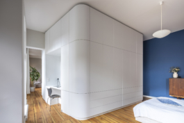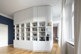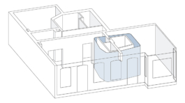 Dort, wo früher Küche und Bad in der kleineren Wohnung waren, ist jetzt ein Bad mit großer Dusche. Um diese neuen Räume ist das Möbel angeordnet, welches je nach Raumseite verschiedene Funktionen bietet. Im Wohnzimmer ist es ein Regal mit Schränken. Im Schlafzimmer bietet es Kleiderschränke – dazwischen liegt an der Fensterseite ein Sekretär mit Schreibtisch und auf der anderen Seite befinden sich der Eingang zum Bad.